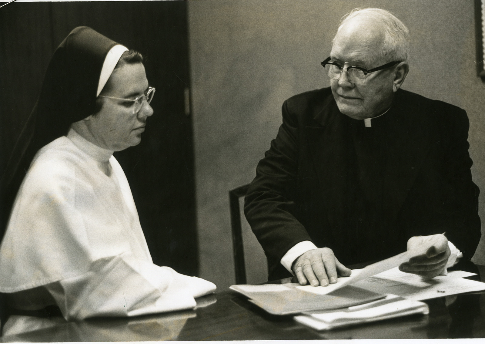 Sr. Mary Michaeline Green, O.P. meets with Msgr. Herman Lohmann who was in charge of the Holy Childhood Pontifical Mission Association in the Diocese of Baton Rouge. Sr. Fidelis, the sister of Msgr. Lohmann, was in Sr. Michaeline’s community.