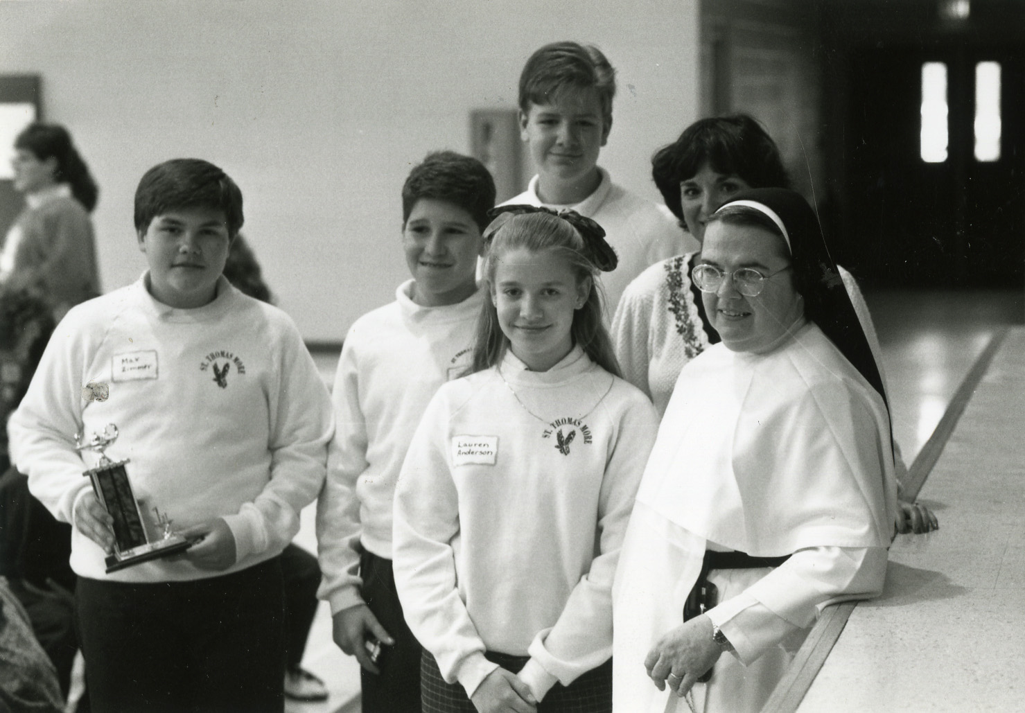 Sr. Mary Michaeline Green, O.P joins club moderator and the St. Thomas More Catholic School students who were Quiz Bowl Winners.