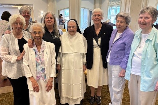 At her Jubilee celebration in New Orleans, Sr. Mary Michaeline Green, O.P. (center) with Sr. Angeline Magro, O.P. (front, left), Sr. Judith Zynda, O.P., Sr. Pat Thomas, O.P., Sr. Kathy Broussard, O.P., Sr. Suzanne Brauer, O.P., Sr. Mary Ann Culotta, O.P. and Sr. Therese Leckert, O.P. Joining the celebration were Sisters from the Dominican Sisters of Peace, Adrian Dominican Sisters, and 140 friends and family members as Sr. Michaeline celebrated her 70 years of service to God’s people.